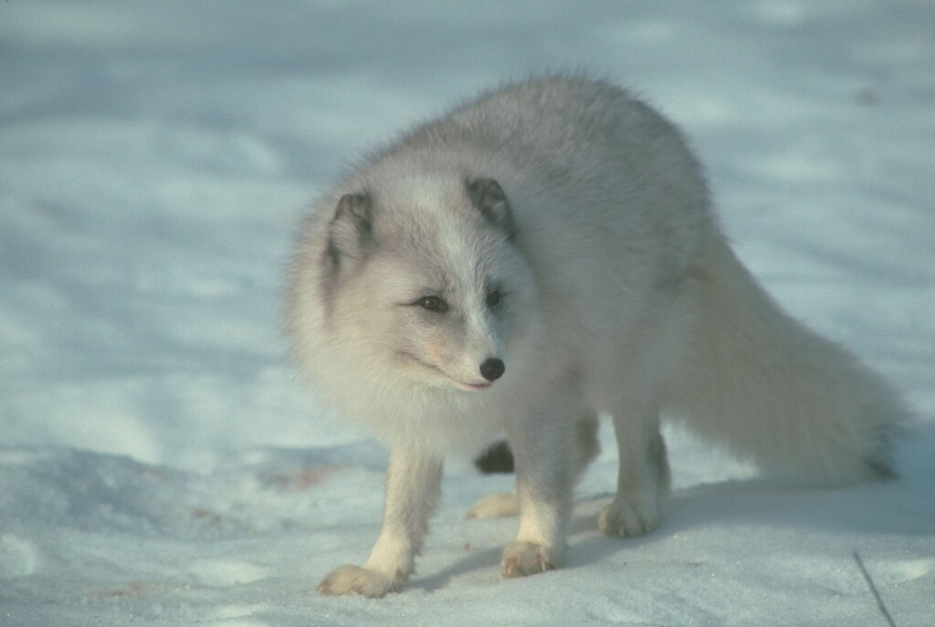 - den im Winter schneeweißen, im Sommer braun-weißen Polarfuchs (Alopex lagopus), der mit seinem extrem dichten Fell in den klimatischen Extremregionen der Tundra und der Arktis lebt.